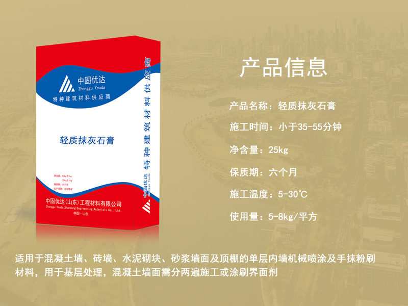 轻质石膏抹灰砂浆也叫做轻质抹灰石膏、轻质粉刷石膏,是以高纯度的半水脱硫石膏为主要胶凝材料,加入无机轻集料和适量的保水剂、缓凝剂等外加剂,经工厂预混制成的成品抹灰石膏。可广泛取代传统的水泥砂浆找平,用于室内建筑内墙和楼板的抹灰找平是建筑内墙以及顶板常用的一种抹灰材料,可以代替水泥以及石灰砂等,在适用性非常广泛,适用于任何墙体,克服传统抹灰的缺点,而且这种抹灰粘接力非常的强,能够与任何基材进行粘接,不会受到厚度的限制。在流动性以及饱水性上也是非常的,可以在0度进行施工,这种石灰膏环保无味、抗裂性效果好,具有保温隔热的效果,能够调节室内的湿度、干度方便施工,节省工期和界面处理的工序以及材料使用,镇江轻质粉刷石膏,墙面冲筋找平。
